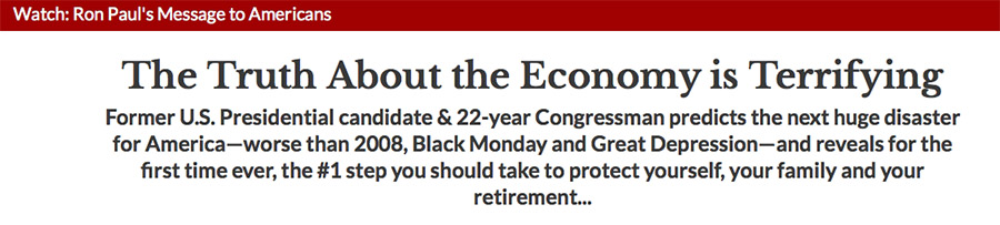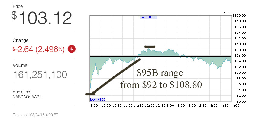______________________________________________________________________________________________ Advertisement ________________________________________________________________________________________________________________________ ![]() AUGUST 24, 2015 The stock market took a dive Monday morning, falling to 15,370 from Friday's 16,459 close. As stocks dropped precipitously in the first half hour of trade, the overall bond market jumped, before both calmed slightly by afternoon. The bond prices settled, while the stock market tested the upper limits of its range. At the end of the day the 10-year treasury yield dropped to 2.01% from 2.05%, the 20-year fell to 2.42% from 2.44% and the 30-year dipped from 2.74% to 2.73%. While, according to the Treasury the 3 month yield jumped back up to 0.06% (where it was mid last week) from 0.03% at Friday's close. From 15,370 the Dow Jones Industrial Average gradually lifted to the 16,000 mark, before jumping to 16,215 around 12:00pm. Monday mornings have exhibited a similar, albeit less drastic trend in recent months. Whereby the market either opens high, or low, then has moved in the opposite direction. By the end of the day the Dow dropped 3.52% to 15,871 and the Nasdaq fell 3.82% to 4,526. Colgate (CL) dropped from $64.98 to $50.84, before rapidly ascending to the $62 range. Procter & Gamble (PG) took a dive from $71.84 to $65.02, before returning to the $70 range. Apple went from $105.76 to $92.00, a $13.76 drop. Apple has approximately 5.7 billion shares outstanding, and has instituted a buyback program. So, the drop this morning represented an approximate $78.43B dollar shift. However, then Apple climbed back to the $100 range, regained the $104 range then rose above its opening price to $108.80 before settling. Apple retook the approximate $78.43B in value, then added about $17B in value. For an approximate total of a $95B range in the first 3 hours of trade. The company's stock closed lower at $103.15, which represents a $15.2B lower market cap for the day. Apple Tries Sailing In Today's Strong Winds $95B is not simply a fortune, it is a greater sum than the GDP of about 124 nations. Though by the end of the day's trading Apple's market cap settled around $587B, from the morning low of approximately $524B. Source: Apple Investor Relations (8/24/2015) One important consideration is, some investors have set price levels to automatically sell positions. So, major temporary price shifts could affect certain positions more than others. However, some investors are looking for certain levels to buy. Apple was one of the few companies to pull out of the red, from the morning's 6.6% correction, though the company could not sustain the momentum. Some Promotions Of Economic Weakness Hit The Money, Though May Use Broken Clocks Some groups take to promoting market predictions, that sometimes influence investors. For instance one such campaign currently is called: RonPaulUpdate.com, the website appears registered by Stansberry & Associates Investment Research LLC. The Ron Paul promoted advertisement campaign appears on both television commercials and some financial news sources. ![]() According to Wikipedia the publisher of Ron Paul Update: "(created) the 2011 online video and infomercial titled 'End of America.'" While this group has made some accurate predictions, some appear to be exaggerative. The fact is: Predicting the market is dependent on what some call broken clocks. Of course this goes to the old anecdote, broken clocks are right twice a day. Simply to say, the future can not be predicted (unless you have a time machine.) Here is an example of one sponsored advertisement, that appears on Yahoo! Finance's homepage, news feed: Source: Yahoo! Finance Homepage Some groups promote a certain prediction, and they are right sometimes. Recent promotions have used politicians' likenesses, like Ron Paul, and give the impression the stock market "will" go down. Here is an excerpt from the homepage of the Ron Paul Update site: One of the objectives of the site, appears to be the sale of books published by Stansberry via a 1 year subscription for $49.95. Notice this excerpt from the Ron Paul Update says: "Research Report #1: The Tax-Free Way to Make 500% in America Today": Source: Ron Paul Update Other promotions literally say people should withdraw 'all their money from ATMs.' These types of advertisement campaigns promote the prediction the economy could weaken severely, though some appear to state their prediction almost as fact. The fact is there has historically been a trend for light volume, and overall weakness between May and September. Last summer bucked the trend when the market outperformed. In general this is to say the stock market is underperforming and the market hit a 2,981 total point drop from the Dow's 18,351 March 2015 high, to today's 15,370 low: Or 16.24%, where 10% is considered a correction. Though, the 15,700 level represents a 14.45% drop. While 16,000 represents a 12.81% drop, which would be closer to correction territory. This level is in deed all-important as an economic indicator, though while used often, short-term performance is not necessarily predictive. A new factor can come into play and cause change that can either be positive or negative; this is simply another constant. So, as it turns out the Ron Paul advertisement was right, in the short-term. There is the compounded condition of politics, where current political candidates have seemingly not placed a priority on the economy in general. So, not only is there a recent trend of volatility around political terms, the topic of the economy has not been discussed, because the topic of immigration and personal promotion of candidates has created a tug-of-war between the politicians to curry favor amongst voters. Additionally, it is next to impossible for anyone to utter the words: "Thanks Mr. President, for fixing the economy's broken capacitor." The Economy Owes Some Gratitude